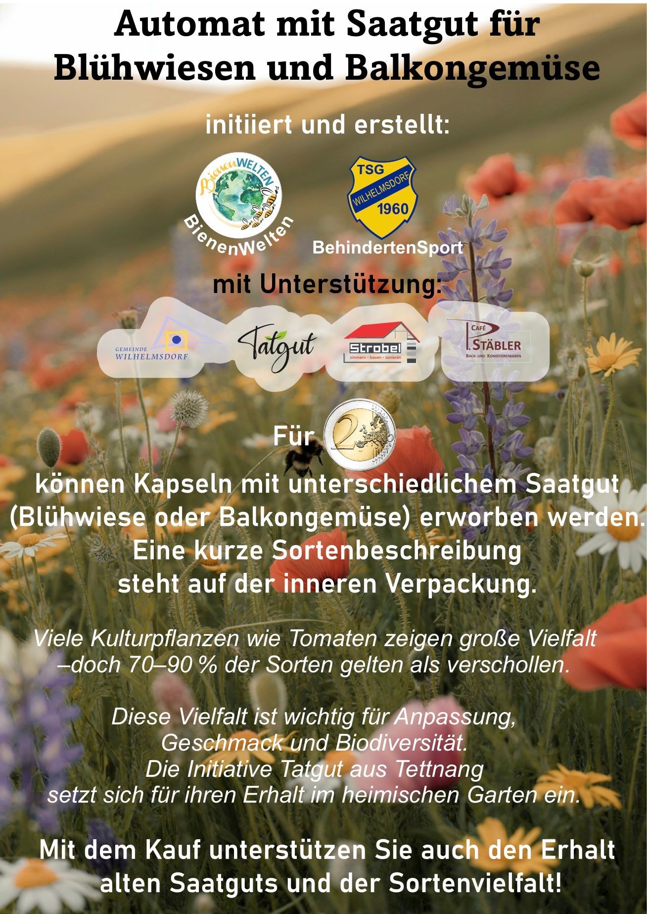 Auf unsere Initiative wurde am Saalplatz in zentraler Lage in Wilhelmsdorf ein Automat gefüllt mit verschiedenen Samenkapseln aufgestellt. Der Automat wird von BienenWelten und der Abteilung Behindertensport der TSG Wilhelmsdorf betrieben.